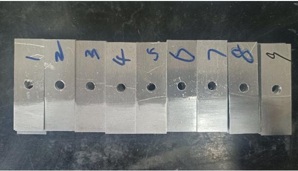 我們選取的砂布目數為:60、120、180、320、600、800、1200、1500、2000。我們分別按1-9給這個(gè)試片進(jìn)行排序。1代表60目,2代表120目...,我們能從打磨痕跡看出,號數越大的,打磨越細膩,1500和2000目砂紙打磨的硬鋁試片基本能呈現出鏡面光澤。(下面的圖片拍攝可能是反光問(wèn)題,不能看出差異,實(shí)物實(shí)際是很能看出來(lái)區別的,不信你試試,哈哈)