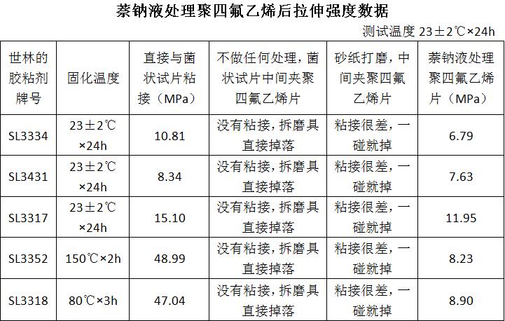 1.經(jīng)萘鈉液處理之后的5種膠粘接強度明顯要高于不做處理的,至于這五種種環(huán)氧膠的粘接對比此數據可能存在一定的偏差,目前就測試后的數據來(lái)看是SL3317最好。因為有些模具的邊緣沒(méi)有與PTFE粘到一起。